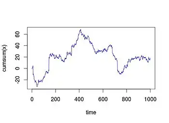 Stochastic process with random increments from a symmetric stable distribution with α = 1.7. Notice the discontinuous changes.