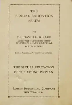 Sexual Education of the Young Woman is an educational book, published in 1923 and written by a psychiatrist and author David H. Keller (1880- 1966). The book provides sexual education guidelines for the girls above the age of six years old.[1] The guidelines concern biological knowledge about the female and male bodies, discussed in the context of prevailing moral and social norms. The book is intended to be read by the young girl herself or conveyed by her parents. As such, it is not only a source of knowledge but also a parenting tool. Sexual Education of the Young Woman contains 13 chapters, each dealing with a different topic of sexual education. It has clear views on the issues of morality and social norms- women are depicted as fundamentally different from men. The author suggests that the life purpose of a woman is giving birth and raising children as well as assuring a cozy and relaxing life for her husband. However, Dr. Keller stresses the importance of proper general and sexual education, and the influence it has on the happiness of a future mother and wife. Sexual Education of the Young Woman is a part of a 10 volume collection The Sexual Education Series released in 1928.[2]