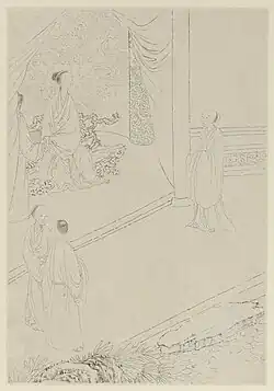 Shangguan Wan'er (664 – 21 July 710)[2] was a Chinese politician, poet, and imperial consort of the Wu Zhou and Tang dynasties. Described as a "female prime minister,"[3] Shangguan rose from modest origins as a palace servant to become secretary and leading advisor to Empress Wu Zetian of Zhou. Under Empress Wu, Shangguan exercised responsibility for drafting imperial edicts and earned approbation for her writing style. She retained her influence as consort to Wu's son and successor, Emperor Zhongzong of Tang, holding the imperial consort rank of Zhaorong (昭容). Shangguan was also highly esteemed for her talent as a poet.[4] In 710, after Emperor Zhongzong's death, Shangguan was killed during a palace coup that ended the regency of Empress Dowager Wei.