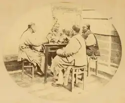 ![]() A Shanghainese man and woman on a wheel barrow, pre-1898. | |