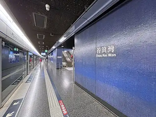 Shau Kei Wan (Chinese: 筲箕灣; Cantonese Yale: Sāaugēiwāan) is a station on the Hong Kong MTR Island line in the neighborhood of Shau Kei Wan. Its concourse is located underground, and an island platform is used to serve trains on the Island line, to and from Kennedy Town and Chai Wan. Its station livery is blue.