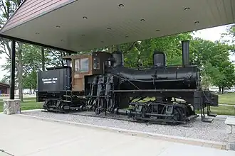This Shay locomotive was constructed in 1898 by the Lima Locomotive Works[2] for the Boyne City Southeastern Railroad Company.[3] In 1918, it was sold to Michigan Forest Products in Strongs, Michigan, and then, in 1924, to William L. Saunders, President of the Cadillac Lumber & Chemical Company,[4] later called the Cadillac-Soo Lumber Company, for service in Sault Sainte Marie, Michigan.[3] It was used there until 1954, when T. Walter Kelly, Mayor of Cadillac and Saunders' son-in-law, obtained it from the Cadillac-Soo Lumber Company and donated the locomotive to the city of Cadillac.[2] It was partially restored in 1964, and further restored in 1985. It now serves as a tourist attraction in Cadillac's City Park.[2]
