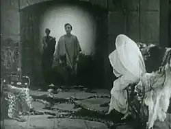 Running at 24 minutes 40 seconds and released on 26 December 1911,[2] She was Thanhouser's first two-reel production. Made quickly in a week, probably in November 1911, the film marked Thanhouser's attempt to depict the epic romance of H. Rider Haggard's tale of love across the centuries. Made on a low budget (the characters arrive off the African coast in a row boat!)[4] the film was made with only a dozen or so actors and extras and cheaply painted scenery. Despite the claim that "The Thanhouser picture of She was made in several different locations, some of them requiring the company to travel 500 miles"[8] in reality a few icy November coastal locations in upstate New York, including Long Island Sound,[7] stand in for the East African coast; and while the production boasts a real camel in the desert scenes the buildings in the distance are clearly not African. In the tomb scene in Part II where James Cruze as Leo Vincey looks upon the dead body of himself as Kallikrates, double exposure photography was used. In the scene where "She" shrinks into the small mis-shapen creature a child or dwarf was used in make-up.[3][7][9]