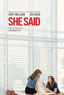 She Said is a 2022 American drama film directed by Maria Schrader and written by Rebecca Lenkiewicz, based on the 2019 book by reporters Jodi Kantor and Megan Twohey. The film stars Carey Mulligan and Zoe Kazan as Twohey and Kantor, respectively, and follows their New York Times investigation that exposed Harvey Weinstein's history of abuse and sexual misconduct against women. The film also stars Patricia Clarkson, Jennifer Ehle, Samantha Morton, and Andre Braugher, in his final film role before his death in 2023. Ashley Judd appears as herself.