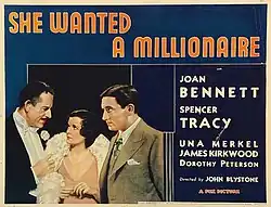 She Wanted a Millionaire is a 1932 American pre-Code romantic drama film starring Joan Bennett and Spencer Tracy.[1] The film, produced and distributed by Fox Film Corporation, was directed by John G. Blystone and also features Una Merkel.[2] It is the only film that Bennett and Tracy made together in which she was billed over Tracy. They also played the top-billed romantic leads in Me and My Gal (1932), Father of the Bride (1950), and Father's Little Dividend (1951).