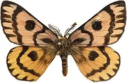 The sheep moth has a 5.5-8.5 centimeter wingspan and a relatively slender body. Its forewings are pink with a yellow streak in the middle and the hindwings are yellowish with variable black markings. There is an all-black form near Mount Shasta.[1] The larvae are black with branched yellowish spines that become orange in later development and an orange-brown head.[1]