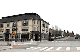 The name "Sherwood" came either after Sherwood Forest in England or Sherwood, Michigan[6][7] In 1885, the Smocks gave a right-of-way on their property to the Portland and Willamette Valley Railway. The Smocks platted the town in 1889, the same year rail service began. Tradition has it that no one, not even the town's founders, liked the name "Smock Ville," and so a public meeting was held to rename the town.[8] Robert Alexander, who was both a local resident and prominent businessman, suggested the name "Sherwood." According to post office records, Alexander was from Sherwood, Michigan,[9] and also said the forest which surrounded the city was like Sherwood Forest in England. The U.S. Postal Department began sending mail to the Town of Sherwood, Oregon, on July 5, 1891. Smock was the first postmaster. The Town of Sherwood was incorporated under Oregon Senate Bill 36 in 1893.[10][11]