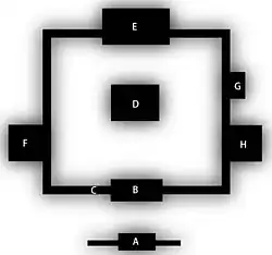 According to a 13th-century text,[10] "a garan is a temple with a hon-dō (main hall), a tō (pagoda), a kō-dō (lecture hall), a shōrō (belfry), a jiki-dō (refectory), a sōbō (monks' living quarters), and a kyōzō (scriptures deposit, library)."[2] These are the seven listed as shichidō elements of a Nanto Rokushū (南都六宗, Nara six sects)[11] temple.[1]