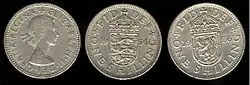 1956 Elizabeth II UK shilling showing English and Scottish reverses