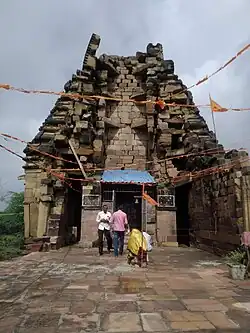 The interior part of the temple is square in shape, each side 8 feet 6 inches (2.59 m). The walls of the shrine are 2 ft 7 in thick (0.79 m). The shrine has a circumlocutory passageway or pradakshina which is of 2-foot-6-inch width. This passage gets natural lighting from two open cut-stone perforated windows. Of the original hall or mandapa of the temple, which had a width of 18 ft 9 in (5.72 m), only the northern wall has survived. There are a few well-carved sculptures on the wall. The spire of the temple is well-executed with ornamentation of eight triangle-shaped sculptures in the form of chaitya windows on each face of the spire. Hemmed between the windows are well-crafted sculptures of human figures. These sculptural formations are repeated one above the other in gradually reducing size, as the height of the spire increases. At the corners of the shrine, there are miniature spires, and the same type are built above them in an interior set-in feature which lies at the main large central spire. The external faces of the spires are well-ornamented with elegantly carved sculptures.[5][7][6] There are many stone sculptures of Yakshas around the temple premises. An annual fair is held here which is attended by a large number of devotees.[4]