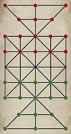 An expanded alquerque board is used. Two triangle boards are attached to two opposite sides of an alquerque board. Each player has 16 pieces that are distinguishable from the other player. Pieces are placed on the intersections (or "points") of the board, specifically on their half of the alquerque board, and the nearest triangular board.