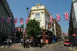 The western stretch, one of the prongs that runs off Seven Dials, was known as Queen Street until 1903.[1] The eastern stretch was named Shorts Gardens after William Short, the gardener of Gray's Inn who purchased the land in 1590 when it was still open countryside outside London and was owned by his descendants until 1690 when it was sold off for development.[2][3] The western end featured houses built in the late 17th century and intended for the rich, but during the following century this became a slum as part of the rookery of St Giles. The eastern stretch had poorer inhabitants from the beginning and at one point became a centre for Italian organ grinders. This gave way over time to warehouses servicing the fruit trade in nearby Covent Garden market.[2] When built, it was residential; it is now largely commercial. Neal's Yard runs off the street as does Nottingham Court. At Seven Dials on the corner between Shorts Gardens and Monmouth Street is The Crown pub, dating back as tavern to at least 1700.[4]