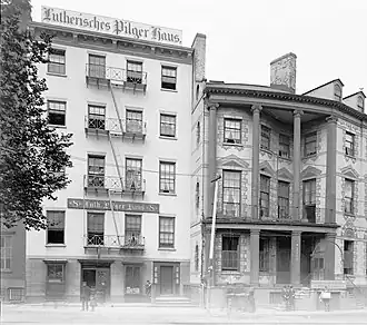 After the Civil War, Irish author Charlotte Grace O'Brien bought the James Watson House to be the Mission of Our Lady of the Rosary, which served as a way station for young immigrant girls.[1] The parish was established in 1884 as a mission[4] and raised to parish status in 1886 when Cardinal John McCloskey directed that Lower Manhattan and the Harbor Islands be separated from St. Peter's Parish and constitute the Parish of Our Lady of the Rosary.[5]