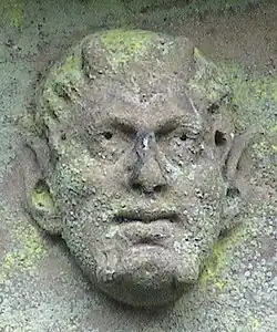 Inside the portico is a rusticated arch, which frames a relief fashioned by the Flemish sculptor Peter Scheemakers.[6] The relief is a copy of the Poussin painting Et in arcadia ego and shows a woman and three men, two of whom are pointing to a tomb. On the tomb is carved the Latin text Et in arcadia ego ("I am also in Arcadia" or "I am, even in Arcadia").[7] The carving displays a number of small alterations from the original painting, including the addition of an extra sarcophagus placed on top of the main tomb. Below the relief is a stone plaque displaying a ten-letter inscription. The inscription is broken into two lines. There are eight letters, O U O S V A V V, on the first line, and two, D M, below on the second line, placed at either end of the letters on the first line. The letters D M were commonly used on Roman tombs to stand for Dis Manibus, meaning "dedicated to the shades".