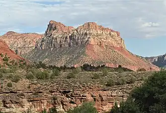 Shunesburg Mountain is situated 3.4 mi (5.5 km) southeast of Springdale, towering 2,000 feet (610 meters) above the floor of Parunuweap Canyon. It is wedged between Shunes Creek and the East Fork Virgin River which drain precipitation runoff from this mountain. This geographical feature is named for the ghost town of Shunesburg which was set between the west aspect of this mountain, and Johnson Mountain, 2 mi (3.2 km) to the northwest directly across the mouth of Parunuweap Canyon.[3][4] In turn, the town was named after Paiute Chief Shunes who sold the land in 1861 to the Mormon settlers who attempted to live there. Flooding from the Virgin River eventually forced the abandonment of the settlement, and drove the inhabitants to nearby Rockville.[5]