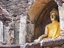 Wat Chang Lom (Thai: วัดช้างล้อม) was built in 1286 by order of Ramkhamhaeng after the discovery of a Buddha relic on the site. The main structure of the temple is a two-tiered square base round the Sri Lanka-style laterite stupa. The name of the temple come from the statues of 39 standing elephants around the first tier of the stupa base. The elephants are remarkably full sized in front of the wall. Normally only the front half of the body is shown as in Wat Chang Rop and Wat Chang Lom in Sukhothai Historical Park. Also on the second tier of the stupa base are 20 niches that were originally filled with 1.4 m high Buddha images. Some Buddha images can still be seen today. There is a ruined vihara in front of the stupa as well as other smaller structures in the temple compound. The main sanctuary is surrounded by a thick wall made of laterite stones.
