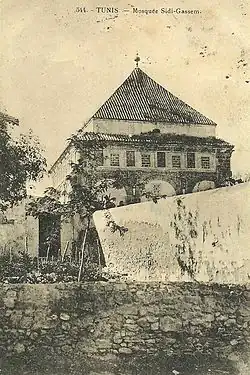 Built during the second half of the 15th century[1] on a hill overlooking the kasbah of Tunis, it was the home of Sidi Kacem El Jellizi, a Tunisian saint born into a family of Andalusi migrants who stayed in Fez before settling in Hafsid Ifriqiya.[2] Nicknamed jellizi in reference to the craft of zellij manufacturing that he exerted with great skill,[2] he was known for his great piety, benevolence and generosity: the place served as a refuge for travelers and traders, as well as Andalusi refugees after the capture of Granada in 1492, which increased his consideration with the Hafsid leaders and the veneration of the population.[2] After his death in 1496, he was buried in the building, which was decorated by himself or his spiritual and artistic followers.[2]