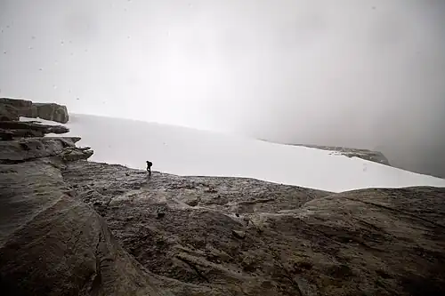 More recently, the lowest altitude to have been observed historically occurred around 1850, during the Little Ice Age. Ever since that time, the glacier has been retreating rapidly, at about 1 km2 per year.[10] The accelerated retreat has been documented by multiple lines of evidence, including satellite or aerial photograph analysis (), historical records and modern-day measurements.[19] Additionally, the equilibrium line elevation (which is an approximation of the mean elevation of the glacier) has been estimated to have decreased from about 4100masl during the last glacial maximum to 4900 masl in present day.[20]
