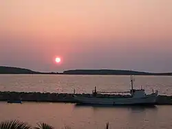 Sigri's harbour and the island of Nissiopi at sunset.