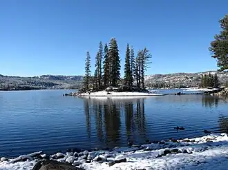 It is located within Amador County. It is about 20 mi (32 km) south of South Lake Tahoe and about 8 miles (13 km) west of Carson Pass.[2] The lake surface is 525 acres (212 ha) at full capacity and is at an elevation of 7,200 feet (2,200 m).[3] It is surrounded by Eldorado National Forest and is part of the El Dorado Irrigation District (EID) and their Hydroelectric Project 184 system.[4] Snow and ice are common in this area during winter seasons.