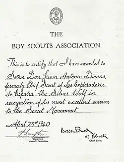 The Silver Wolf Award certificate presented to Juan Antonio Dimas, former Chief Scout of Spain, just a few months after the end of the Spanish Civil War. Spanish Scouting was disbanded by the Franco's regime in that same year.