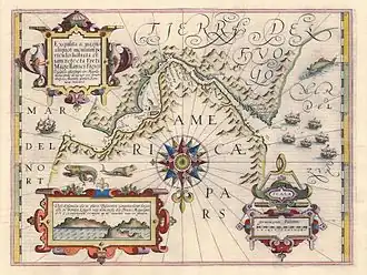 On 10 March 1599, the fleet reached the Río de la Plata in present-day Argentina.[16] By early April, they arrived at the Strait of Magellan, a passage approximately 570 km in length and 2 km wide at its narrowest point, for which they possessed an inaccurate chart of the seabed.[17] Unfavourable winds persisted for the next four months. In August, the crew went ashore, where, under freezing temperatures and poor visibility, they hunted Magellanic penguins, seals, mussels, petrels, and fish. On 23 August, following three weeks of snow and storms, the weather improved.