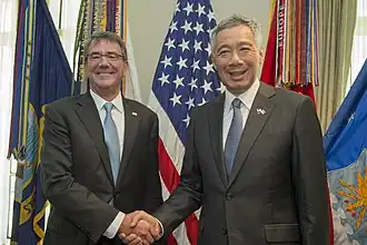 Singapore has long standing military relations with the United States. The United States sells arms to Singapore and provides access to its bases to train the Singaporean military outside of their small island city-state.[24] Under the U.S.–Singapore Strategic Framework Agreement, some U.S. Navy littoral combat ships are rotationally deployed to Singapore's Changi Naval Base.[25] Air Force One also lands at Paya Lebar Air Base whenever the president visits the country. On September 23, 2019, Singapore Prime Minister Lee Hsien Loong and US President Donald Trump renewed a key defence pact which allows American forces to use Singapore's air and naval bases, extending it by another 15 years to 2035.[26] On 1 April 2022, Prime Minister Lee Hsien Loong emphasised that Singapore is not an ally of the United States, Singapore will not be involved in a war of the United States or ask the United States to come to the rescue when something happens to Singapore.[2]
