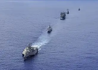 Ships from the United States Navy and the Republic of Singapore Navy travel in formation in 2019.