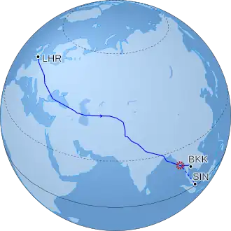 The 777-312ER encountered severe turbulence at around 07:49 UTC on 21 May 2024 (14:19 local time)[3] over Kanasoekone in Myaungmya District, Myanmar, around 360 nautical miles (667 km; 414 mi) from Bangkok.[5][6] Cabin crew members were in the midst of serving breakfast[7] when the turbulence became sufficiently severe for unsecured passengers and objects to become airborne inside the cabin.[5][6] Tracking data showed that the aircraft was at an altitude of 37,000 feet (11,278 m) at the time of the encounter.[8]
