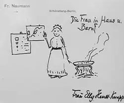 Käthe Schirmacher took an opposing position to Lischnewska in that she saw housework as socially necessary, productive professional work and demanded its economic, legal and social recognition and remuneration.[31] Elly Heuss-Knapp also rejected a "socialist solution" to the women's question and opposed the one-kitchen house solution, even though she welcomed technical progress and the improved infrastructure in the household. However, these would not be reflected in the reduction of housework, as the emotional and mental demands on the housewife would increase. However, such services could neither be provided by the market nor by cooperatives.[32] In this sense, the majority of BDF women rejected the one-kitchen house. More promising in the debate about the double work of women was an orientation towards the systematization of work in the individual household and its rationalization through technical innovations. Part of the women's movement focused primarily on organizing and training housewives.[33]