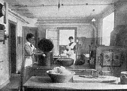 A particular influence on the concepts of the one-kitchen house was Hull House in Chicago, opened in 1889 by Jane Addams (1860–1935) and Ellen Gates Starr (1859–1940), who co-founded the American settlement movement.[18] Hull House was one of the first community practice facilities and was located in the middle of an immigrant neighborhood. From here, both direct help and cultural education were offered to the immigrants and refugees living in the neighborhood. At the same time, it was a research center for social issues, on the basis of which women in particular demanded socio-political reforms. In addition to social and community work, the house served as accommodation for both female workers and professional intellectuals, mostly immigrant women. With the aim of improving the living conditions of the women, a central kitchen was set up, from which the approximately 50 residents as well as people from the neighborhood were supplied. The women had the choice of ordering food to their homes or eating it in the communal dining room. This was both a meeting place and the starting point for a wide range of cultural and political activities.