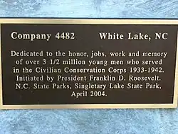 The National Park Service began purchasing the land surrounding Singletary Lake in 1936 for a recreational demonstration project. Out of work young men were employed by the Civilian Conservation Corps, which was established by United States President Franklin D. Roosevelt in 1933 during the Great Depression with many of the facilities of Singletary Lake State Park. The land was managed by the Resettlement Administration until 1939. From 1936 until 1939, youths working for the CCC built the Singletary Recreation Center. They constructed an office, maintenance buildings and recreation facilities on the shore of Singletary Lake. The CCC also built a ten cabin camp with a dining hall, workshop and recreation hall.[5]