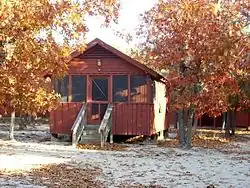 Camp Ipecac was built in 1939 by the Resettlement Administration and the Civilian Conservation Corps during the Great Depression.[8] It houses 92 campers in ten cabins. It is named for the Carolina ipecac, a herb that is used in traditional medicine. Camp Loblolly Bay was built in 1984 and houses 48 campers.[8] It is more modern than Camp Ipecac and is open year round. Camp Ipecac opens in April and closes in October. Both camps include a mess hall and restrooms. Recreational facilities at the camps include outdoor basketball courts, a beach volleyball court and horseshoes. Charcoal grills are available in the picnic area with picnic tables.[7]