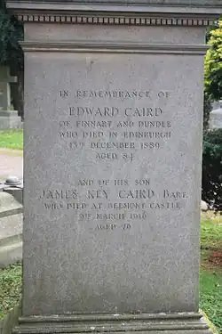 Caird died at his Perthshire estate, Belmont Castle near Meigle, which he had purchased after the death of its previous owner Sir Henry Campbell-Bannerman.[4] The baronetcy became extinct upon his death. He is buried with his father in Dean Cemetery in Edinburgh just west of the central roundel, under a modest stone..