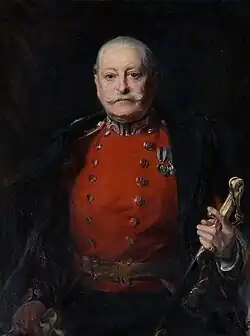 In 1934, Sir John's portrait was painted by Philip de László. In the portrait, he is seated "wearing the ceremonial uniform of the Life Guards with decorations, a black great coat over his shoulders, holding a sword in his left hand and a glove in his right resting on his knee".[3] László had previously done a number of portraits for the family, including his wife in 1913, daughter Sylvia in 1924, and son Richard and daughter-in-law Lady Lettice. in 1931.[3]