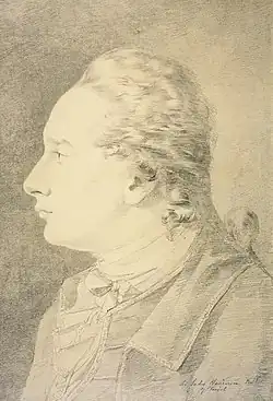 In 1781, he married Anna Loudoun Robertson (d. 1782), daughter of General James Robertson, then serving as governor of the Province of New York.[11] Anna Robertson was painted in 1771 by Angelica Kauffman.[12] His wife died in childbirth of their first and only child, Anne Isabella Henderson (1782-1844), who married Admiral Phillip Durham in 1818.[13] Additional "natural children" were John Francis Wheatley Henderson, Maria Wheatley Henderson, Emilia Elizabeth Henderson, Charlotte Strickland Henderson, and Robert Strickland Henderson.[14]