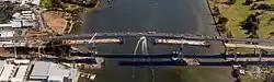The Sir Leo Hielscher Bridges, formerly and still collectively referred to as the Gateway Bridge, are a pair of twin road bridges that carry the Gateway Motorway (M1) over the Brisbane River, skirting the eastern suburbs of the city of Brisbane. The western bridge carries traffic to the north and the eastern bridge carries traffic to the south. They are the most eastern crossings of the Brisbane River and the closest to Moreton Bay, crossing at the Quarries Reach and linking the suburbs of Eagle Farm and Murarrie. The original western bridge (formerly named the Gateway Bridge) was opened on 11 January 1986 and cost A$92 million to build.[1][3] The duplicate bridge was opened in May 2010, and cost $350 million.[1]