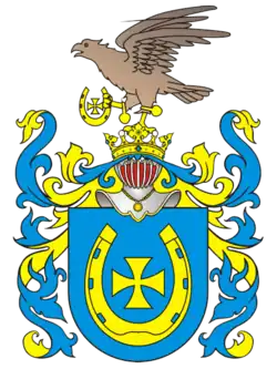 The Skłodowski family originated in the village of Skłoty (now Skłóty) in Mazovia's Płock land. The earliest recorded family member was Velislaus (Welisław) de Sclothowo, who appeared in the Łęczyca court book on 20 June 1391.[1][2] In the 16th century a family branch using the surname Krasznicki seu (Latin: "or") Sclothowski settled in the village of Kraśnica in Konin County.[3] Descendants of this branch later appeared in Lviv County and the Duchy of Siewierz.[3] They used the surname Sarnowski.[2] In the 17th century another branch settled in Vitebsk Province of the Grand Duchy of Lithuania.[1]