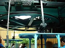 The ride consists of a single continuous cable, held up by evenly dispersed supports. From this moving cable, dozens of cabins hang, each one carrying up to four passengers (or 680 pounds).[4] These are open cabins with four seats (two rows of two, facing each other). At each station (one at Cheetah Hunt Plaza, one at Stanleyville), a large wheel with a pulley-like groove rotates the direction in which the cable is moving. Incoming cabins are transferred from the moving cable to a stationary steel track, along which the wheels of each cabin glide. They are brought to a stop by two park employees. While one holds the vehicle in place, the other opens the cabin door as the passengers exit. The door is then closed and the vehicle is thrust around the turn. On the other side of the large wheel, another employee re-opens the door and new passengers enter the cabin. The door is re-locked and the cabin is pushed hard enough to transfer it from the steel track to the moving cable. Once on the cable, the wheels above each cabin are not used, but the cable transporting it rests within a slot between the wheels.