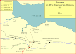 A 4+12-mile (7.2 km) extension—the Slamannan and Borrowstounness Railway—was built to Bo'ness, opening on 17 March 1851.[14] The Slamannan and Borrowstounness Railway Act 1846 (9 & 10 Vict. c. cvii) of 26 June 1846 authorising this extension, also allowed the railway to lease the harbour at Bo'ness but this lease was not followed through.[14]