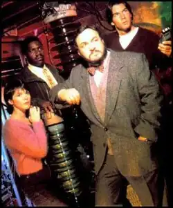 The original Sliders: From left to right: Wade Welles (Sabrina Lloyd), Rembrandt Brown (Cleavant Derricks), Professor Arturo (John Rhys-Davies), and Quinn Mallory (Jerry O'Connell)
