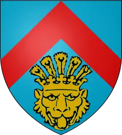 The coat of arms of the Smør-family had a blue background, and a golden Leopard's head under a red chevron.[3] The family is sometimes alternatively called "Leopard's head (under chevron)" after the coat of arms.