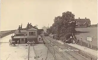 Smeeth, a scattered village community of a few hundred persons in the early 1840s, was initially ignored by the South Eastern Railway (SER) when it constructed its mainline through the area to reach Folkestone. Situated 4.5 miles (7.2 km) from Ashford, the small village was primarily a farming community producing wheat, barley, oats, beans and peas; the grain was processed at Evegate Mill on the River Stour to the south of the railway line, which was the most substantial structure in the area.[2] In 1850, six years after opening the South Eastern Main Line, a deputation of local tradesmen pressed the SER to open a station in the village, arguing that the potential goods traffic that could be generated would outweigh the lack of passenger receipts. Although there was little to suggest that Smeeth could justify and support a railway station, the SER agreed to the venture. A site was chosen 1 mile (1.6 km) to the south of the village at a point where the Bonnington to Smeeth road (now the B2069) crossed the railway line. The land was owned by the Knatchbull-Hugessen family, Sir Edward Knatchbull-Hugessen being the local Member of Parliament and, in later years, a director of the SER.[2]