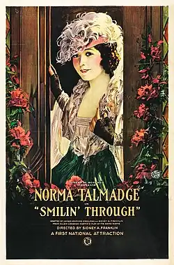 Smilin' Through is a 1922 American silent drama film based on the 1919 play of the same name, written by Jane Cowl and Jane Murfin (together under the pseudonym Alan Langdon Martin). The film starred Norma Talmadge, Harrison Ford, and Wyndham Standing. It was co-written and directed by Sidney Franklin, who also directed the more famous 1932 remake at MGM. The film was produced by Talmadge and her husband Joseph M. Schenck for her company, the Norma Talmadge Film Corporation. It was released by First National Pictures. Popular character actor Gene Lockhart made his screen debut in this film.[3][4]