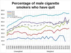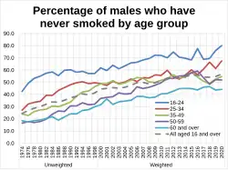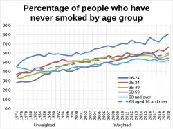 In 2015, it was reported smoking rates in England had fallen to 16.9%, a record low.[20] In 2018, the UK smoking rate had fallen to 14.4%.[21] 25–34 year olds had the highest smoking rate, with approximately 1 in 5 people within this age range (around 1.4 million adults) being smokers.