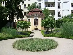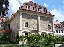 In 1777, with the assistance of the publisher Conrad Georg Walter, the theatre moved to a larger building in Borngasse (near the current location of the German Hygiene Museum), but after Walter's death the following year, it moved again on 7 December 1779 to its current home, a garden building in the courtyard behind the residence of the government secretary Johann Christoph Hoffmann at Hauptstraße 19.[5] This had been built in 1740 in Baroque style, intended for masquerades, but never used. It accommodated an audience of 250 and a 24-piece orchestra.[6] The 6 by 5 metres (20 ft × 16 ft) stage was small even then; it was illuminated with wax or tallow candles in special holders designed to reflect the light on the desired spot.[3] The interior was by Johann Ludwig Giesel, who also designed the interior of the original Gewandhaus in Leipzig. The design for the curtain in 1779 was by Johann Eleazar Zeissig, known as Schenau, a director of the Dresden Academy of Fine Arts; it depicted, amongst genii and garlands of roses, scenes from Greek mythology, such as Thalia, the muse of comedy, showing a youth the way to the temple of virtue while a bacchante tried to draw him towards the temple of lust.[6]