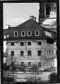 The building was not destroyed in the bombing of Dresden on 13 February 1945, but fell into increasing disrepair after the war. In the 1950s and 60s, urgently needed repairs were not made, and from the 1970s on, the building was abandoned. Despite the renovation of the Hauptstraße beginning in 1978, the intention was to gut and demolish the building.[18] The architect Jürgen Mehlhorn, who had become interested in the building while still a student and was now using it to store material for the reconstruction of other buildings on the street, in 1979 designed a keystone for the main entrance at Hauptstraße 19 depicting two theatrical masks and with the inscription "Societaetstheater 1715 1779 1979".[18] The association "Interessengemeinschaft Societaetstheater" was then founded; in 1992 this became "Societaetstheater e.V." The association worked to preserve the building and raised money for urgent repairs such as roof work and provisional safety measures. In 1985, the building became a registered landmark of the German Democratic Republic.[19] More extensive repairs were made in 1989. After German reunification in 1990, Dresdner Bank sponsored the building's restoration. The Dresden city council decided in October 1994 that the theatre would be operated by the city once restored, and work began in 1996.