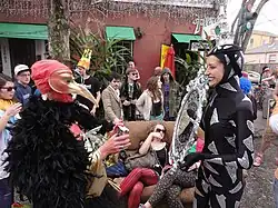 "La Société de Saint Anne" is a New Orleans Mardi Gras marching krewe that parades each Mardi Gras Day. La Société de Saint Anne was founded in 1969 by residents of the French Quarter and nearby Faubourgs who recognized the need for a return to earlier traditions of "walking krewes" which at one time were more prevalent but which had been overshadowed by the development of larger float parades in the early 20th Century. As the float parades grew in scale and number, they were forced to move out of the narrow streets of the French Quarter and onto broader avenues uptown and in mid-City. The walking krewes were groups of neighbors from various wards of the city who took to the streets on foot, in celebration of their common love for the City of New Orleans and the food, music, drink, spirituality, and lifestyles that developed there during the 18th, 19th & 20th centuries. La Société de Saint Anne was formed to bring the celebration back down to street level and to revive this old tradition of celebration in the residents' own area. In the ensuing years, as the more bohemian elements of the French Quarter were forced to move further downriver to the Marigny and Bywater neighborhoods by rising property values and rents in the French Quarter, the krewe grew in size and inspired many other such walking krewes to form as subkrewes or as separate krewes altogether. The original krewe now can be identified by the cluster of crabnets (beribboned hoops carried aloft on long poles) and the presence of the Storyville Stompers.