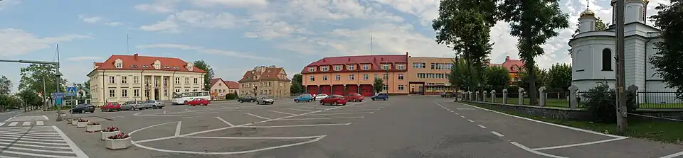 Kościuszko square in Sokółka with the town hall to the left and Saint Alexander Nevsky Orthodox Church to the right