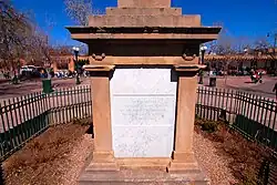 The Soldiers' Monument is a cenotaph at the center of the Santa Fe Plaza, a monument collectively memorializing deaths in several specified military battles. Erected in 1867 in the aftermath of the American Civil War,[1] it consisted of a 33 feet (10 m) stone obelisk atop a plinth; only the plinth stands currently, and exhibits some damage. During the late nineteenth century, the monument was used as a place for Union veterans to gather at annual Memorial Day events to decorate the cenotaph and hear brief presentations.[2][3]